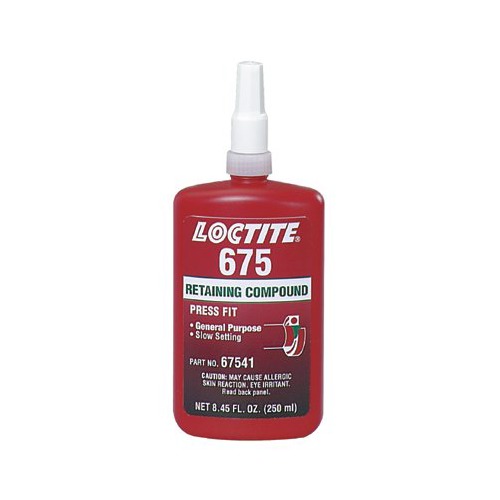 LOCTITE675是一种通用型胶粘剂,主要用于固持所有类型圆柱形配合件。它属于一种低粘度,自行固化的胶粘剂,在铁或铜合金金属面之间固化。对于其它金属或热固性塑料,需要使用乐泰底剂T或N。产品的工作温度范围是65°F~300°F。