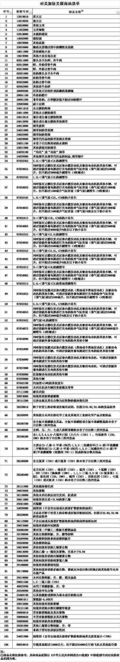一、加征关税的商品为大豆、汽车、化工品等14类106项商品。征税范围详见附表。