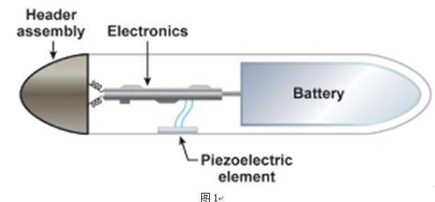 图1标示的是双压电晶体振动传感器在起搏器的脉冲发生器中的位置。