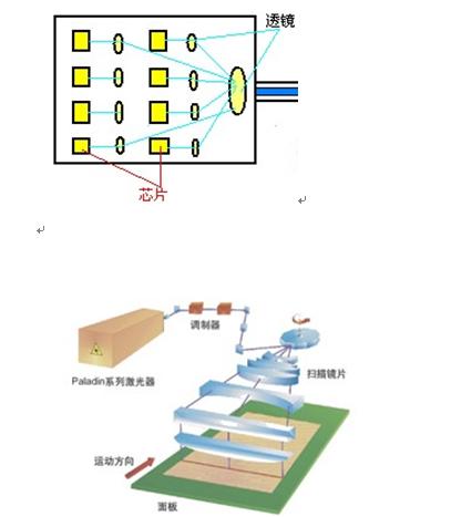 泵浦源里面有一系列的芯片阵列,每个芯片前端都有一个透镜进行光线的汇聚,若每个芯片功率是10W,那么阵列8个即最后的泵浦源功率就为80W,8个透镜的光纤最后汇聚到一个出口处的透镜传导到光纤出来,应用于打标及切割等。