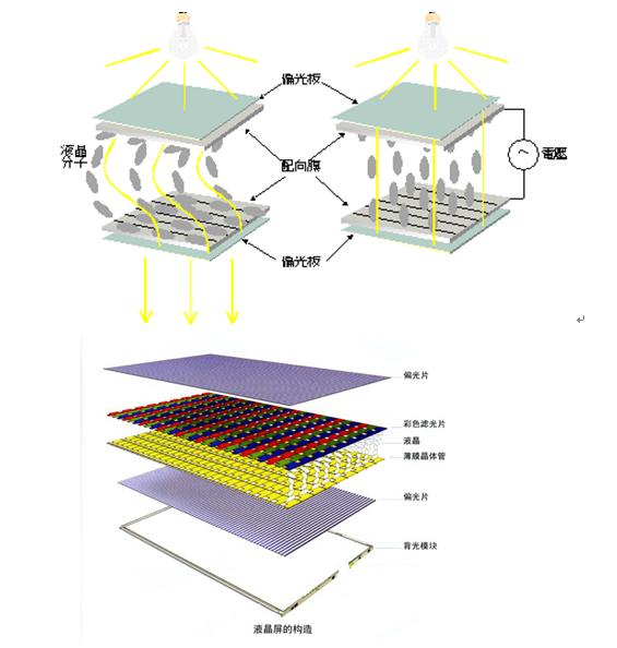 液晶显示器(LCD/Liquid Crystal Display)的显像原理,是将液晶置于两片导电玻璃之间,靠两个电极间电场的驱动,引起液晶分子扭曲向列的电场效应,以控制光源透射或遮蔽功能,在电源关开之间产生明暗而将影像显示出来,若加上彩霞色滤光片,则可显示彩色影像.