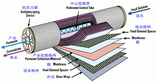 如醋酸纤维素膜、芳香族聚酰肼膜、芳香族聚酰胺膜。表面微孔的直径一般在0.5~10nm之间,透过性的大小与膜本身的化学结构有关。反渗透膜因为可以有效的去除水中的溶解盐类、胶体、微生物。有机物等等。在胶粘剂行业系统上,也有着无污染、工艺简单、耗能低等等优点。下面我们来说说反渗透膜: